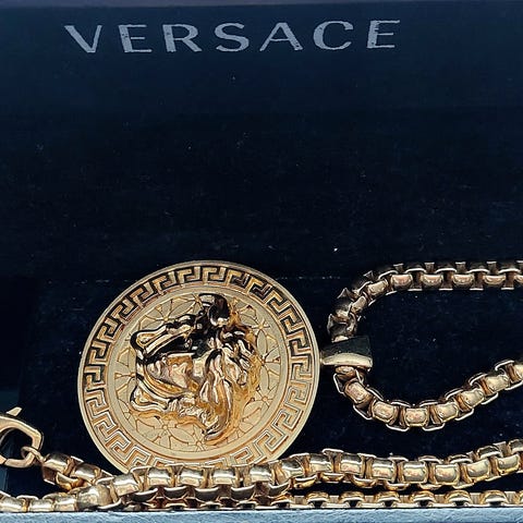 Versace smykke i gullbelagt materiale for unisex. Smykket har en rund anhengsdel med karakteristisk Versace-motiv og en fin lenke i gullbelagt metall. Passer til bruk til hverdags eller ved mer formelle anledninger. Leveres med Versace-eske slik det vises på bildene.