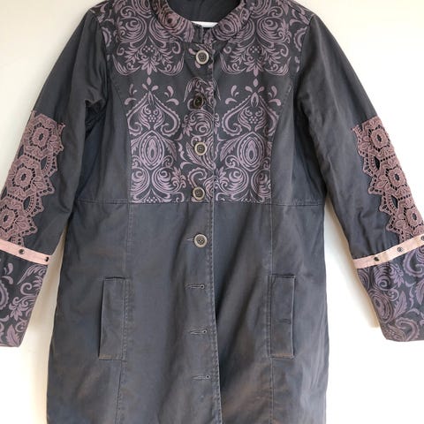 Pent brukt kåpe. Foret og med fuskepels besetning. Glidelås og knapper i front.