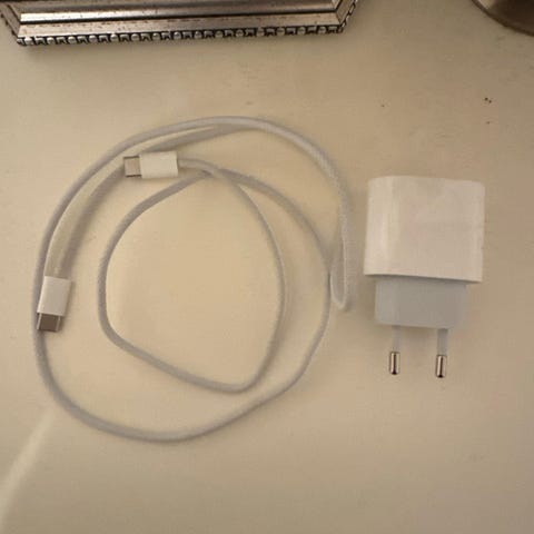 Apple lader med USB‑C‑utgang i hvit farge. Strømadapter for lading av kompatible Apple-enheter via USB‑C‑kabel. Europeisk støpsel med to pinner, egnet for bruk i standard norske stikkontakter. Passer til lading av blant annet iPhone, iPad og andre enheter som støtter lading via USB‑C‑strømadapter (avhenger av effekt og kabel, ikke oppgitt her).