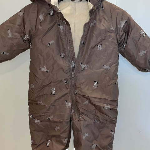 H&M vinterdress for barn i størrelse 80. Dressen er unisex og kommer i brun farge med mønster. Yttermateriale i polyester. Modellen har hette, glidelås foran og strikk ved ermer og ben. Det er refleksdetaljer og fotstrikker nederst på bena. Innside med mykt fôr for økt komfort. Egnet som yttertøy for små barn i kjøligere vær. Du kan også hente fra hjem.