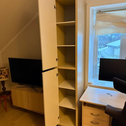 Øverste hylle på 26 cm kan fjernes og reduser total høyde til ca 190 cm