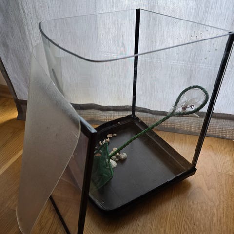 Hjørneakvarium i glass med buet front. Akvariet er utformet for plassering i hjørne Det har gjennomsiktige glassflater med mørke kanter og. Egner seg til bruk som akvarium for fisk eller andre vannlevende dyr, eller som terrarium tilpasset etter behov. Størrelse 90 liter, varmekolbe, rensepumpe, masse dekorasjon og sand, litt div mat, timer for lys, håv, luftpumpe med boble plate av stein. Pm for mer info