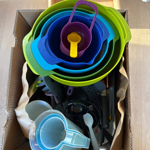 kjøkkenutstyr og servise sett. Inneholder diverse kjøkkenredskaper som sleiver, visper, øser, kniver, sakser, potetmoser, pastasleiv, rivjern og andre redskaper i hovedsak av metall og plast. I tillegg følger det med gryter og lokk samt tallerkener og skåler i servise.