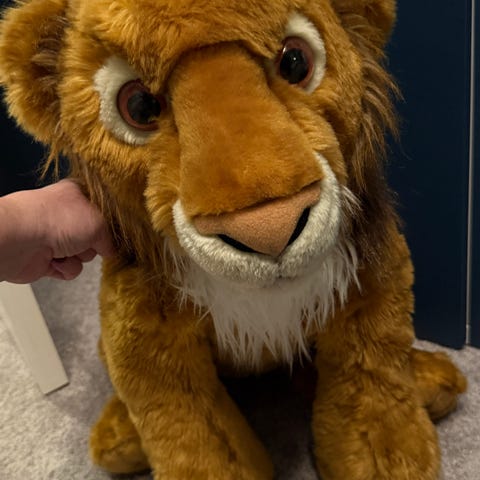 IKEA kosedyr løve i mykt tekstil. Løven er gul med brun manke og hale, og har broderte detaljer i ansiktet og på potene. Egnet som kosedyr eller pyntegjenstand på barnerom. Fra et røyk og dyrefritt hjem.