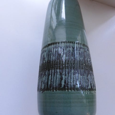 Liten keramikk vase fra Denor fabrikker, ca 1960 . Hvit glasur med innslag av gull striper. Ørlite skår i glasuren øverst på vasen ( kan skjules med litt hvit farge ). H 14,5 cm ø 27 cm