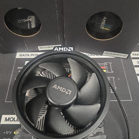 AMD CPU-kjøler med vifte i svart farge. Passer til AMD-prosessorer som bruker denne typen standard luftkjøler. Kjøleren består av en kjøleribbe i metall og en toppmontert vifte for luftkjøling av prosessoren. Egnet som erstatning eller oppgradering av eksisterende AMD-standardkjøler i en stasjonær PC, forutsatt kompatibelt hovedkort og sokkeltype. Denne fulgte med en Ryzen 7 8700G.