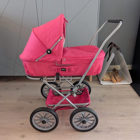 BRIO dukkevogn i rosa tekstil med metallramme.