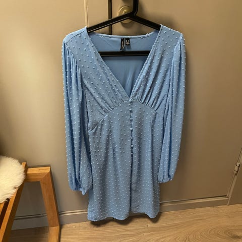En kjempfin blå kjole som kan bli brukt i selskap og som hverdagskjole. Merkelappen er satt til størrelse M, men jeg mener den er et sted mellom XS-S fordi den sitter godt rundt brystet og er kort i lengden. Selges fordi den er blitt for liten for meg.