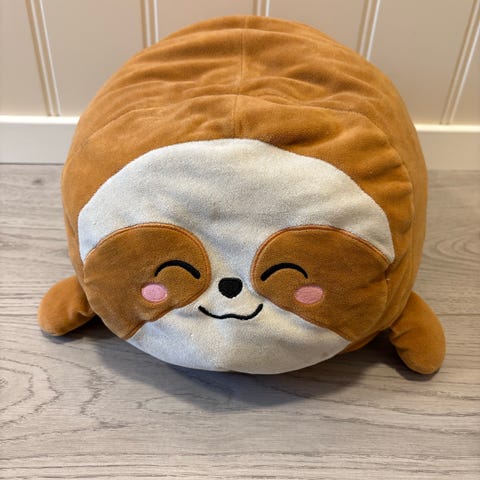 Squishmallows kosedyr formet som en rund hund. Kosedyret har lys brun kropp med mørkebrune detaljer på ører, snute, poter og bunn. Myk plysjoverflate som egner seg som koseleke eller pyntefigur på barnerom. Fra et røyk og dyrefritt hjem.