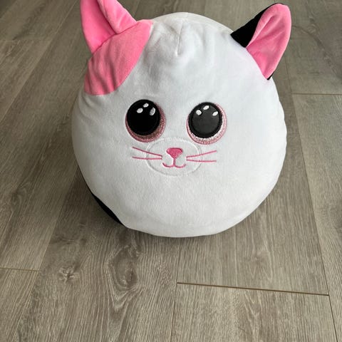 Squishmallows kosedyr formet som en dalmatiner med store øyne og rosa sløyfer på hodet. Mykt plysjmateriale som gjør det egnet som kosedyr eller pyntepute på barnerom. Passer for barn som liker myke og figurformede kosedyr. Fra et røyk og dyrefritt hjem.