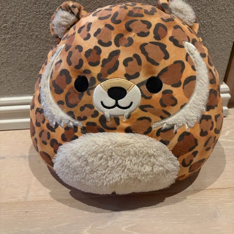 Squishmallows kosedyr formet som en leopard. Myk plysj med leopardmønster og lys mage. Egnet som kosebamse og pute for barn. Fra et røyk og dyrefritt hjem.