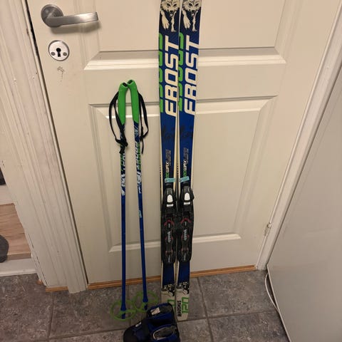 Frost langrennski med staver. Skiene har felle og passer ypperlig for de minste. Lengde på skiene er 97 cm.