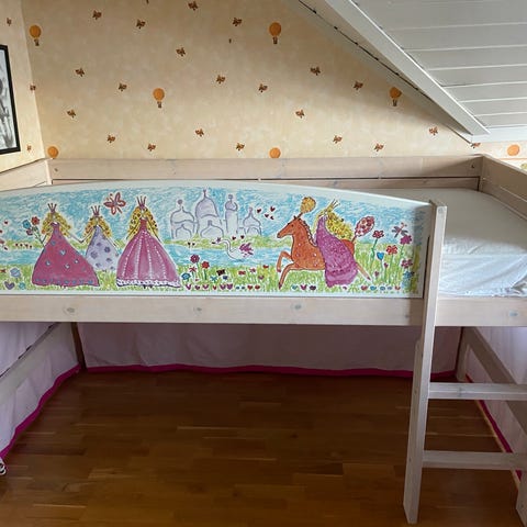 Seng med skrivepult, skuffedel (disse har sort farge) og skap. Denne har noen bruksmerker, men er i god stand. Ny pris for disse ligger oppunder 7000,- Kan bistå med transport og montering i stor Bergen, etter nærmere avtale.