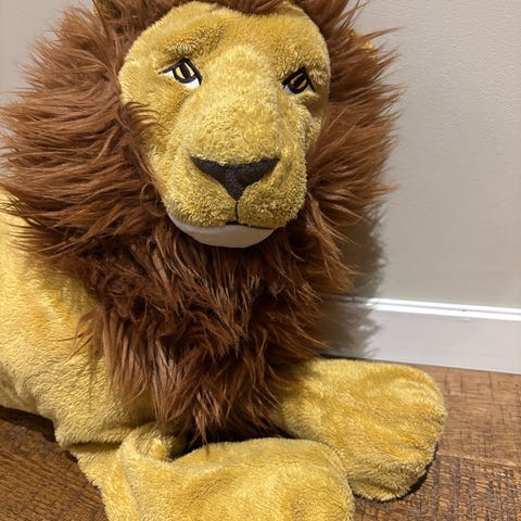 Kosedyr formet som en løve i beige plysj. Myk kropp med strukturert «man» rundt hodet og hale med dusk. Passer som kosedyr eller pyntegjenstand på barnerom. Fra et røyk og dyrefritt hjem.
