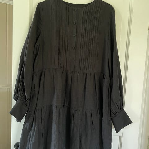ella&il hverdagskjole i lin for dame i størrelse XS. Kjolen er svart og har lange ermer. Den har løs passform med knytebelte i livet som kan justeres etter ønske. Knapt brukt.