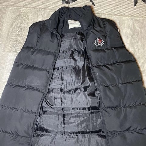 Moncler dunjakke for herre i størrelse S. Jakken er svart og fylt med dun. Den har hette og vatterte partier med glidelås- og knappelukking foran. Ermene er i et annet stoff enn det vatterte partiet på kroppen, og det er lomme med glidelås på ermet. Jakken passer til bruk som ytterjakke i kjøligere vær.