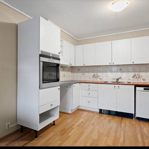 Kjøkkeninnredning i hvit utførelse med over- og underskap, skuffer og benkeskap. Waterguard og komfyrvakt medfølger. Rett, enkel kjøkkenløsning med laminert benkeplate i grått og nedfelt dobbel oppvaskkum i rustfritt stål med ettgreps blandebatteri. Det er plass til frittstående komfyr og oppvaskmaskin i benkeraden, samt høyskap som kan brukes til for eksempel kjøleskap eller oppbevaring. Under vasken er det synlig rør- og avløpsopplegg samt stikkontakt. Innredningen passer til mindre kjøkken, hybel eller kjellerstue der det er behov for en funksjonell kjøkkenløsning.