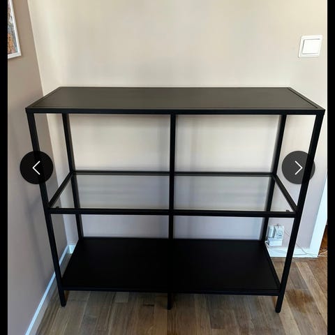 IKEA vittsjo hylle i svart metall med åpen konstruksjon. Hyllen har flere faste hylleplan og en høyde på ca. 175 cm, bredde ca. 51 cm og dybde ca. 36 cm. Egnet til oppbevaring av bøker, dekor eller andre gjenstander i stue, soverom, gang eller kontor. Enkel, rettlinjet design som passer inn i ulike interiørstiler.