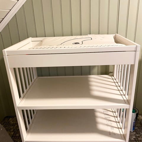IKEA stellebord i tre i naturfarge. Stellebordet har en øvre stelleflate med kant rundt, samt en åpen hylle under for oppbevaring av bleier, klær eller annet utstyr. Egnet til stell av baby og småbarn. Passer på barnerom, bad eller andre rom der det er behov for stelleplass.