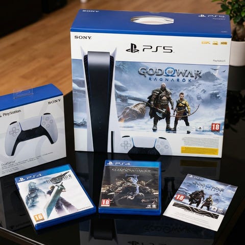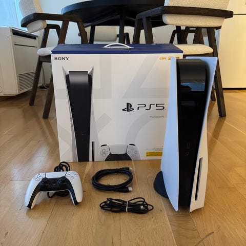 Sony PlayStation 5 spillkonsoll. Konsollen leveres med to DualSense trådløse kontrollere, én hvit og én svart. På bildet vises også et PlayStation Store gavekort. Egnet for spilling av PlayStation 5- og kompatible PlayStation 4-spill, samt strømming av underholdningstjenester der dette støttes.