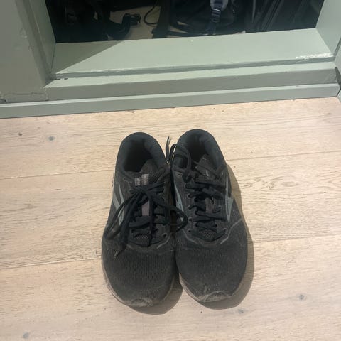 Pent brukt svarte og blå Asics løpesko uten innvendig såle
