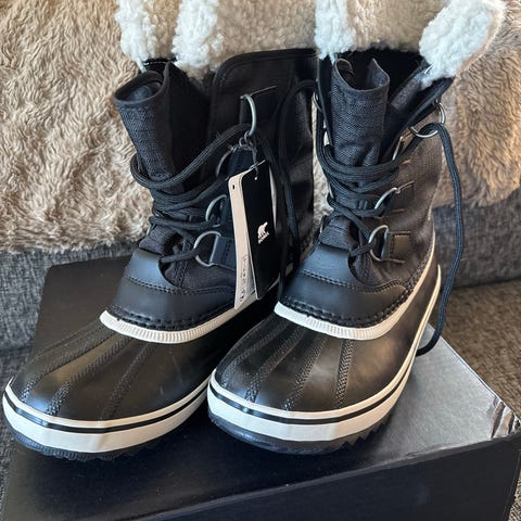 vinterstøvler i størrelse 39. Støvlene har brun overside med svarte detaljer og snøring foran, samt svart hæl- og såleparti. Modellen er ankelhøy med polstret og myk innside som gir ekstra varme rundt foten. Sålen er flat med mønster for bedre grep på underlaget. Egnet som vinter- og høstfottøy i hverdagen.