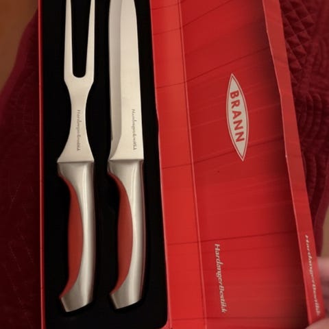 -Hardanger Bestikk Brann tranchersett med kniv og gaffel i rustfritt stål. Settet leveres i original eske med Brann-design i rødt. Håndtakene har innslag av rødfarge som matcher esken. Egnet til oppskjæring og servering av kjøtt og større matstykker etc etc.