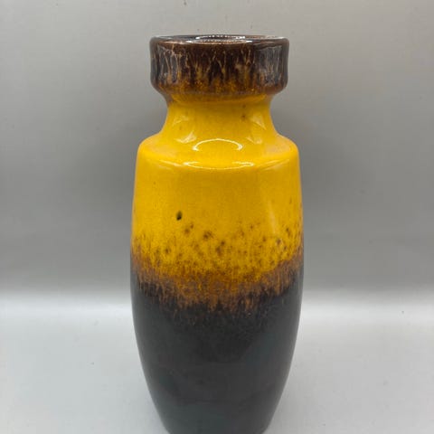 West Germany 550-10 keramikkvase i glasert keramikk. Vasen har oransje glasur øverst med mørke sjatteringer og mørk brun glasur nederst. Den har sylinderformet kropp med smalere hals og rund åpning. Bunnen er merket med «550-10» og «W. Germany». Egnet som dekorasjonsgjenstand eller til blomster og greiner.