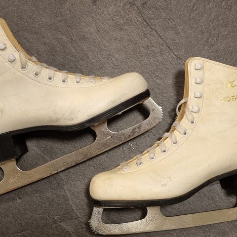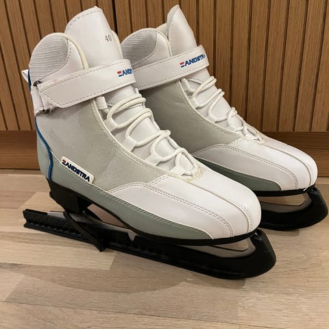 2par Kunstløpskøyter i hvit farge i størrelse 38. Klassisk modell med høyt skaft, snøring og hæl for god støtte rundt ankelen. Blad i metall egnet for bruk på isbaner og skøytefelt. Passer til generell skøytebruk og enkel kunstløpstrening.