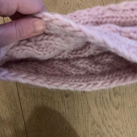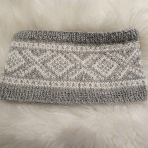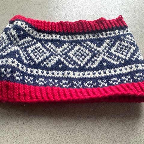 Hjemmestrikket, i lys, lys blå med mørkt blått mønster. (Bildene lyver litt!) Det er strikket litt løst og er derfor meget fleksibelt hva str. angår. Men til et stort barnehode eller et lite voksenhode passer det fint. Det er 10 cm bredt.