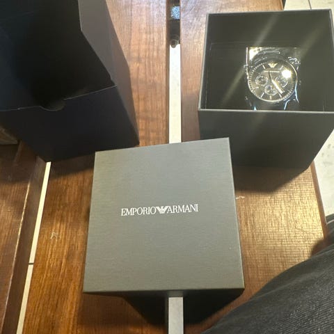 Emporio Armani AR5815 kronografklokke. herreklokke med rund urkasse i stål og sort urskive. Klokken har analoge visere og flere små urskiver i skiven. Bezel med minuttskala. Rem i svart skinn med struktur og klassisk spenne i metall med Armani-logo. Egnet som herreklokke til hverdagsbruk og penere anledninger.