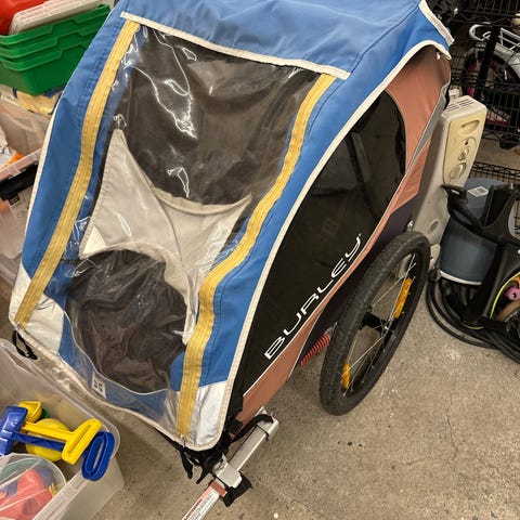 Overtrekk/tak til Burley sykkelvogn for to barn ønskes kjøpt. Evnt. en godt brukt vogn av samme type med helt tak.