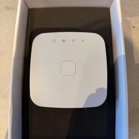 Futurehome Smarthub CUBE-T1V-GW1BE smarthus-hub i hvit farge. Enheten fungerer som sentral for styring og integrasjon av kompatibelt smarthusutstyr. Strømtilkobling via 5V DC, 2,5A. Designet for montering på flate overflater, med festeanordning på undersiden. Leveres med strømkabel og original eske som vist på bildene.