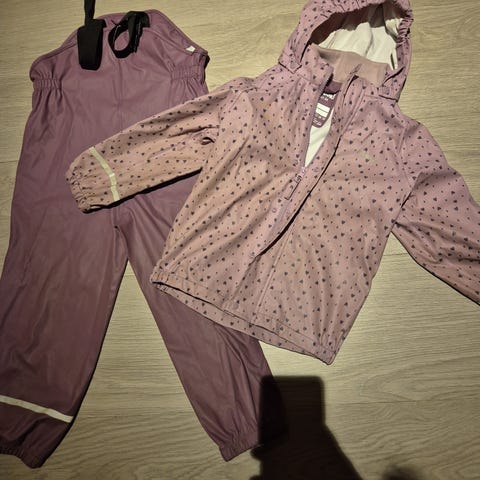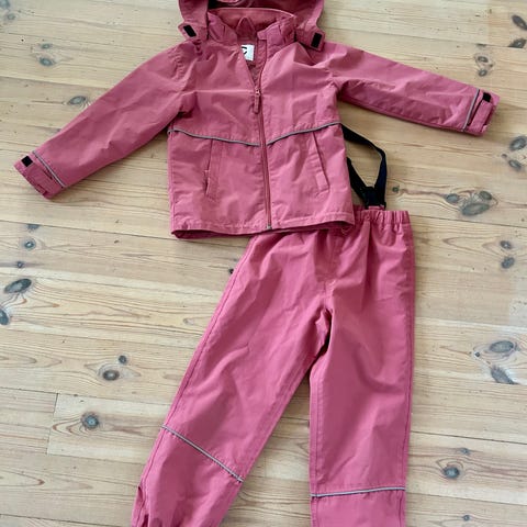 Rosa regnsett fra Okidoko str 110/ 5 år. Godt brukt, synlig misfarget enkelte steder, selges bilder. Trenger nye strikker under bena, ellers hel, uten hull.