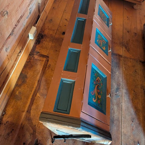 Hjørneskap ii tre med rektangulære fyllingsdører. Skapet har lang, smal form med flere dører plassert etter hverandre. Skapet er beregnet for veggmontering i hjørner og kan brukes til oppbevaring i for eksempel stue, gang eller hytte. Overflaten har synlige bruksspor og patina som gir et eldre preg.