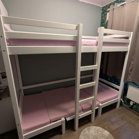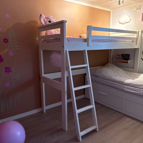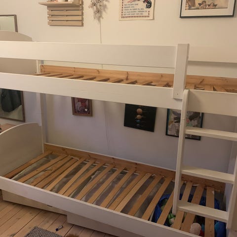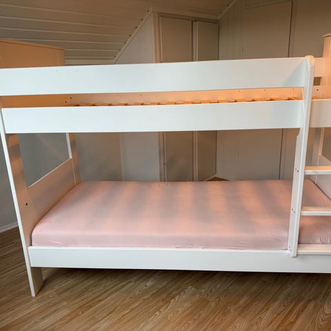 Hvor køyeseng, kan gjøres om til loftseng med sittegruppe. Synlige skjønnhetsmerker og et par klistremerker. Veldig solid seng. Trenger en runde med kluten. Må hentes i ettermiddag/kveld, onsdag.