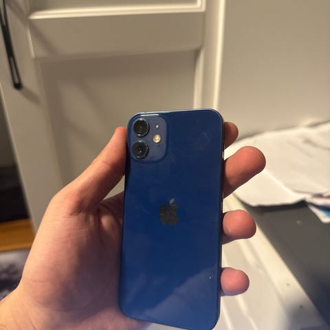 Apple iPhone 12 min med 64 GB lagringskapasitet i fargen svart. Modellen har dobbelttkamera på baksiden og frontskjerm med helskjermsdesign og Face ID.