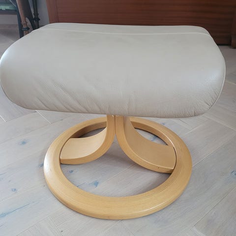 Selger en flott fotskammel av skinn. Den er helt i orden