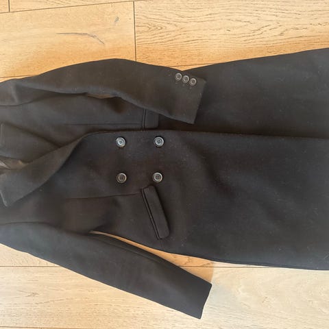 & Other Stories Atelier kåpe for dame i størrelse M. Kåpen er svart og laget i ullblanding, med glatt fôr på innsiden. Modellen har klassisk krage og slag, lukkes med knapper foran og har lommer i sidene. Lengden går omtrent til kneet, avhengig av høyde. Egnet som yttertøy i kjøligere sesonger.