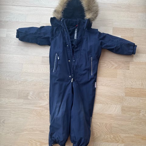 Mørkeblå vinterdress fra wheat i størrelse 104. Brukt av et barn i noen få måneder. Pent brukt. Mangler en fotstrikk, ellers ingen andre merknader.