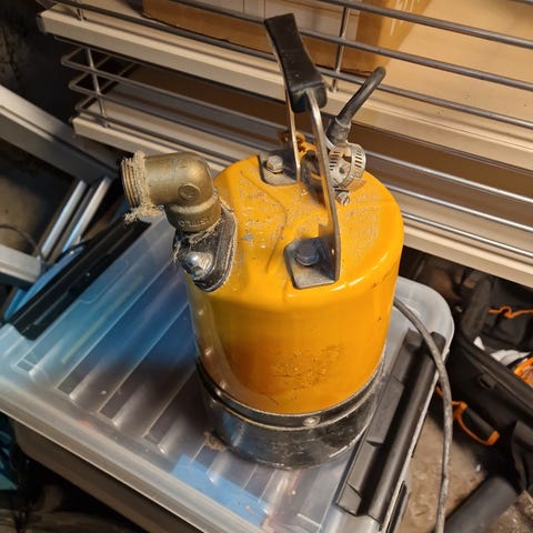 Pumpe som blander å pumper ut avrettingsmasse. Effektivt verktøy. Vi har kun brukt den til avretringsmasse i vårt eie men det skal sies at vi knapt har brukt den. Kun brukt på ca 1,5 hus av oss. Før oss var den i bedrift som har brukt den mere enn oss. Noe mangler er det nok bla risten med kniven på trauet mangler.