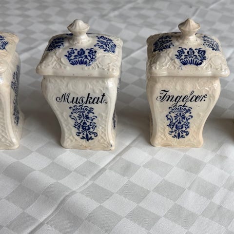 Retro krukker til kjøkken / tørrvarer. Noen bruksmerker. Bare en av de store krukkene har lokk. Store krukker H 17 med lokk 12 uten lokk. 10 x 10 cm bred. Små krukker 12 cm høyde med lokk, 5 x 5 cm brede.