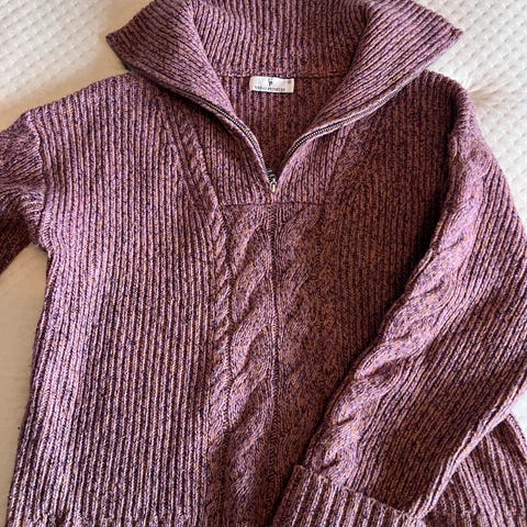 Urban Pioneers genser for dame i størrelse S. Genseren er i gråbeige ull med ribbestrikket struktur. Den har høy hals med glidelås i front og lange ermer.