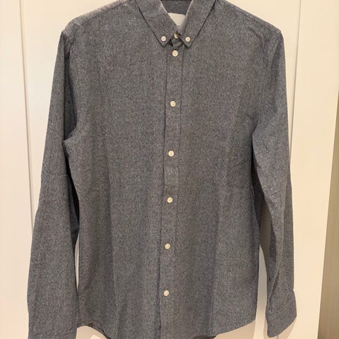 Helt ny skjorte fra Samsøe og samsøe i størrelse S. Skjorten er blå-grå og laget i bomull. Klassisk modell med krage og knappelukking foran.