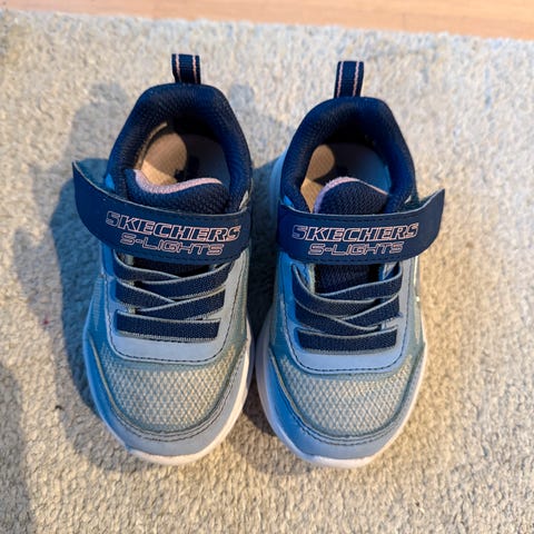 Skechers blinkesko for gutt i liten størrelse 27, tilnærmet størrelse 26. Skoene er i hovedsak blå med detaljer i grønt. Modellen har borrelås over vristen og lys i sålen. Overdelen ser ut til å være i tekstil med syntetiske forsterkninger, og sålen er i gummi/syntetisk materiale med mønster for bedre grep. Egnet som hverdagssko og til aktiv lek for barn.
