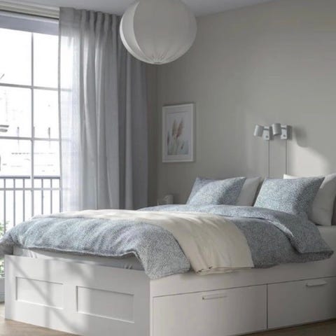 IKEA Brimnes seng med oppbevaring i hvit farge. Sengen har mål på 160/200 cm og inkluderer skuffer for ekstra oppbevaringsplass under sengen.