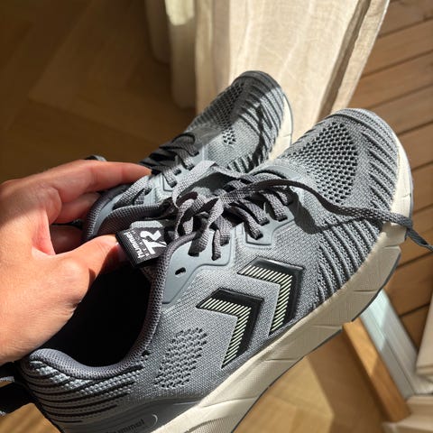 Skoene er hvite med Hummels karakteristiske piler i mørk kontrastfarge på sidene. Overdelen er i pustende mesh-materiale med snøring for justerbar passform. Yttersålen har mønster som gir grep på underlaget.