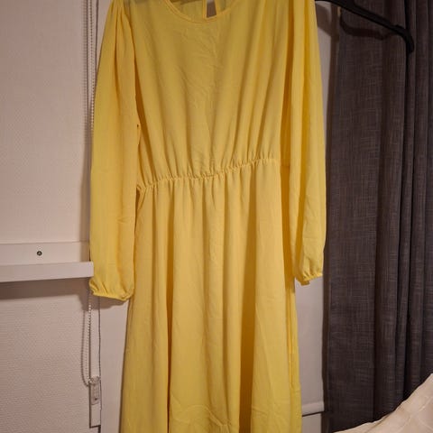 Komfortabel og fin kjole med god stretch i stoffet. Den har v-hals og puffermer med legg på skuldrene som gir en fin puff-effekt. Innsvinget passform med innsnitt ved brystet og snittlinje i midjen. Sømmen på skjørtet gjør at stoffet legger seg flatterende og gir det lille ekstra.