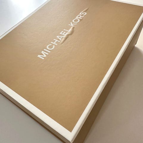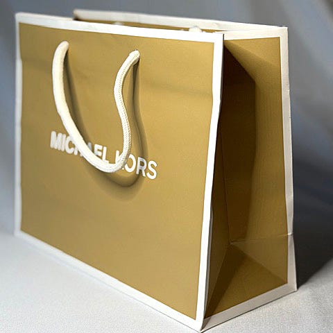 Michael Kors papirpose i beige med hvite kanter og hvite bærehåndtak. Posens design er enkelt med Michael Kors-logo på fremsiden. Egnet til oppbevaring eller som gavepose.