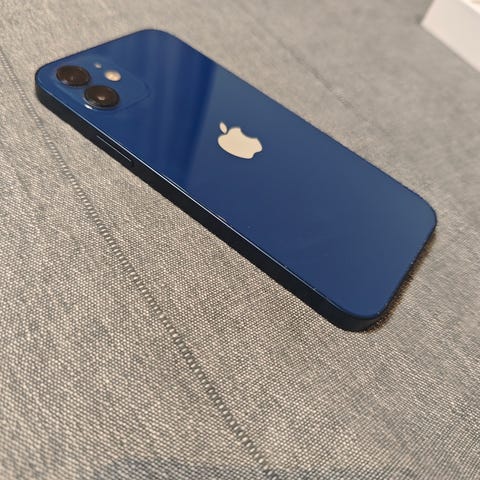 Selger en iPhone 12 med 128 GB lagring. Telefonen er brukt og har synlige bruksspor, som vist på bildene.